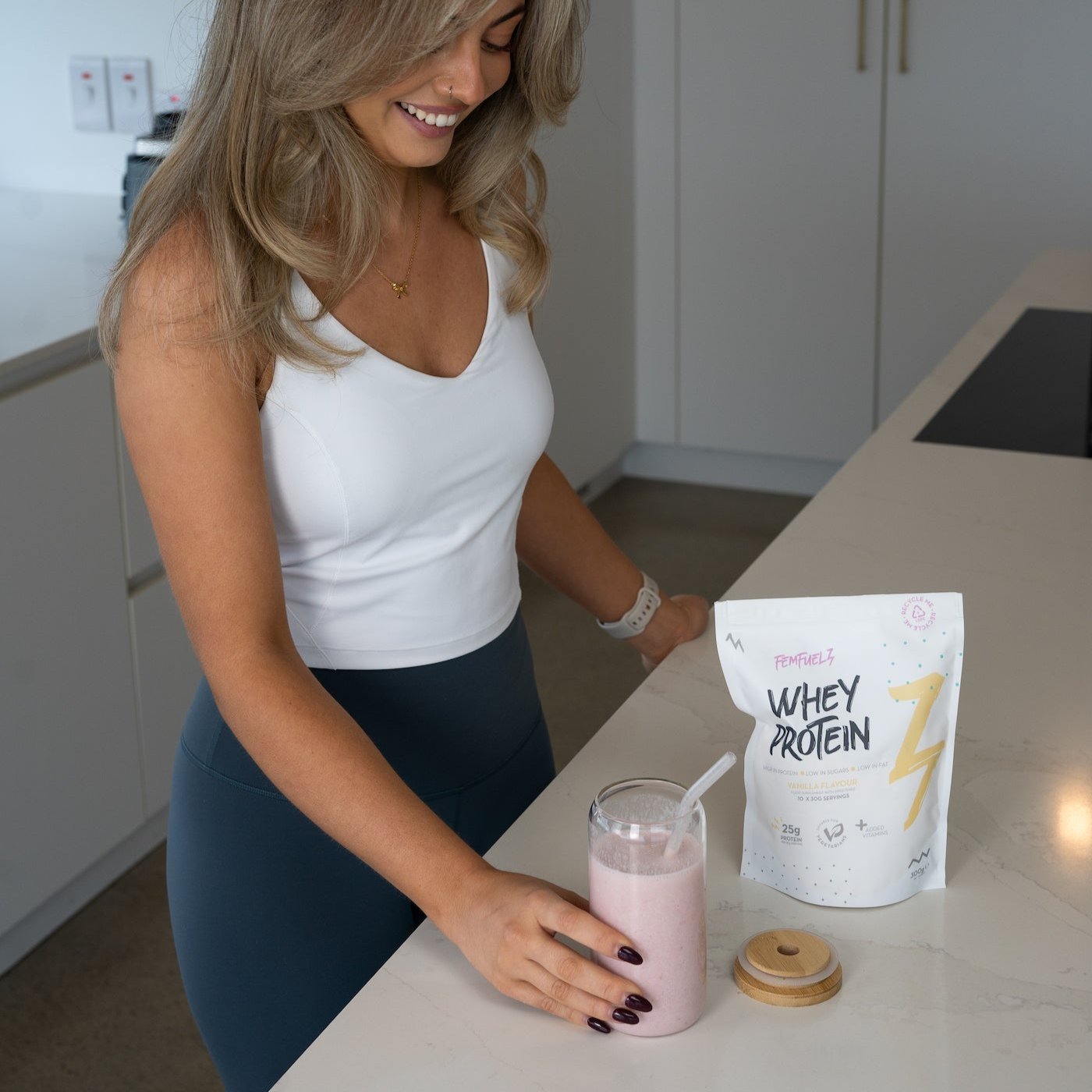 Our whey protein blend is packed with premium protein (24-25g per scoop!) added digestive enzymes to reduce bloating and vitamins & minerals to improve daily wellness!